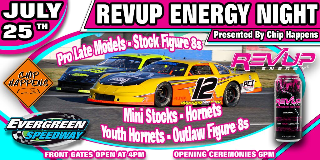 « All Events REVUP Energy Night Presented By Chip Happens July 25 @ 6:00 pm - 10:00 pm $20 « BECU Figure 8 Nationals Buzz Inn Steakhouse 60 Minutes of Fear Presented by PNW Traffic Control » Scheduled to Race* Pro Late Models Super Stock Figure 8s Outlaw Figure 8s Mini Stocks Youth Hornets Add to calendar Google Calendar iCalendar Outlook 365 Outlook Live Details Date: July 25 Time: 6:00 pm - 10:00 pm Cost: $20 Website: https://evergreenspeedway.com/events/saturday-july-25th-2026-revup-energy-night-presented-by-chip-happens/ Venue Evergreen Speedway 14405 179th Ave SE Monroe, WA 98272 United States